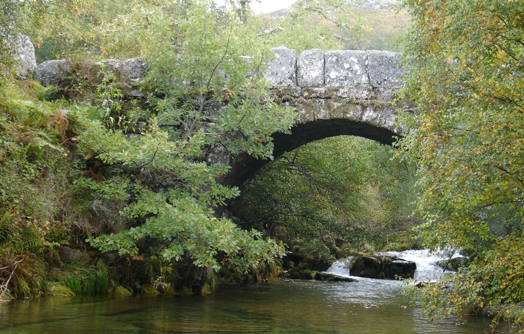 Puente con un tablero formando caballete sensible, precedido por rampas, sobre la base de un arco completo con duelas iguales, con losas de piso y grandes guardias de piedra apareadas.