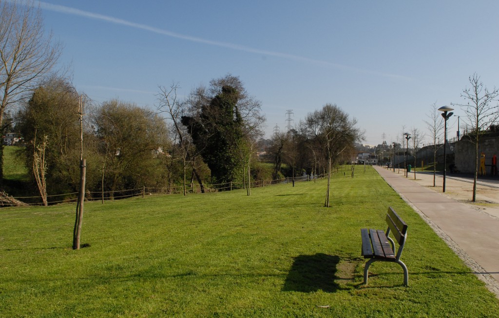 O muro que delimita o parque desde a entrada sul até à entrada oeste é acompanhado por vinha e glicínias. Espécies arbustivas como o folhado e o alecrim ladeiam um campo de mini golfe. No relvado surgem também pontuações de tílias. O acesso à plataforma inferior, marginal ao rio, é conduzido por um alinhamento de chouposnegros. Nesta plataforma, o rio é separado do corredor pedonal, que atravessa todo o terreno, por outro espaço relvado. Surgem aqui várias espécies de árvores, nomeadamente, liquidâmbar, ulmeiro, tília, bidoeiro e Robinia pseudoacacia. Na parte norte do parque foram criados canteiros de Gazania linearis e apténias. Daqui pode-se observar os campos de cultivo do Mosteiro, com uma horta e várias árvores de fruto. As margens do rio Leça são ladeadas por algumas espécies ripícolas características, como o amieiro, o salgueiro e o freixo, por grandes carvalhos, por sabugueiros, por loureiro e por cana, esta última, uma espécie invasora. Na margem direita do rio Leça a paisagem é formada por assentos agrícolas.