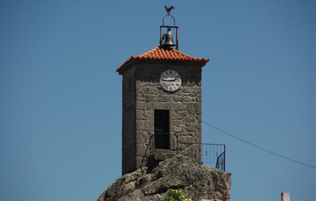 Torre quadrangular, coberta por um telhado de quatro águas e coroada por um sino de bronze.